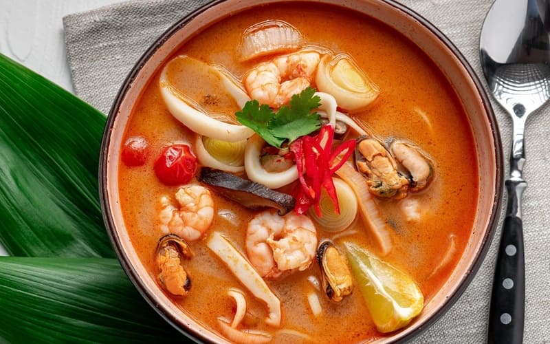 حساء توم يوم حار وعطري مع الجمبري الملكي، الفطر، الطماطم والأعشاب الغريبة. سينقلك هذا الطبق إلى تايلاند بفضل مذاقه الحيوي